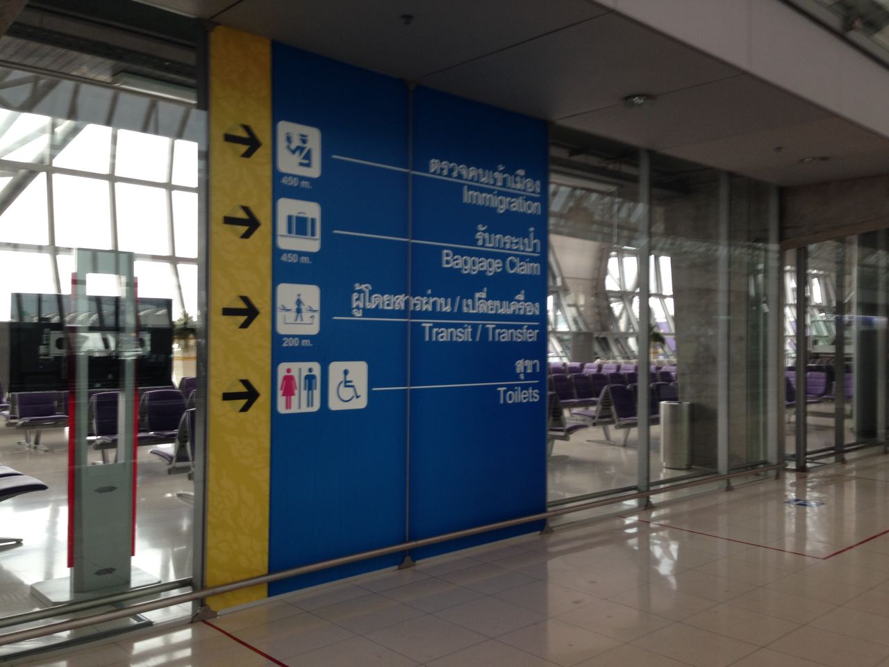 成田の次に慣れ親しんだバンコク・スワンナプーム国際空港に到着。入国審査までは結構距離がある。ここを右にずっと真っ直ぐ行き、最後に左へ曲がる。