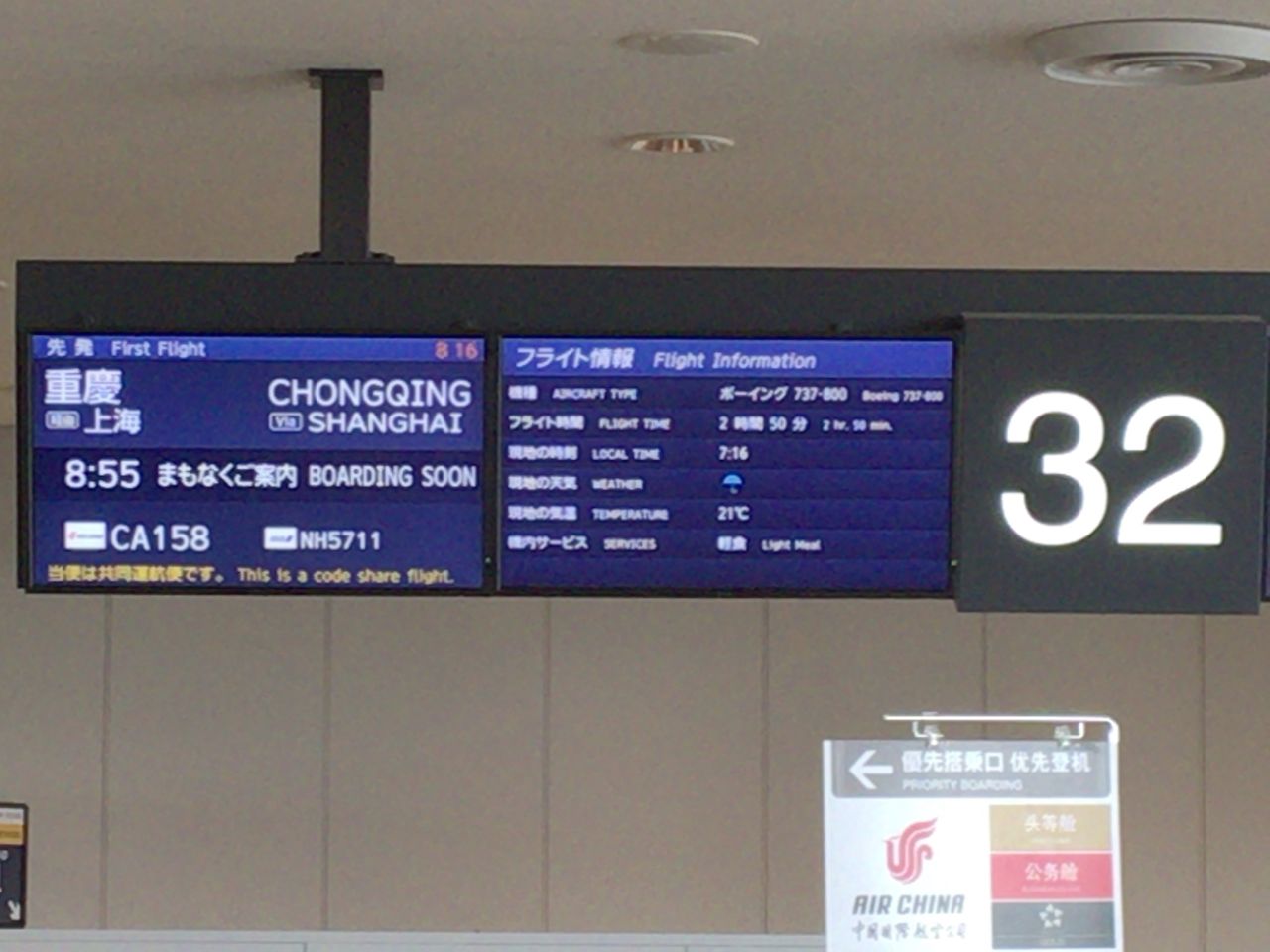 上海経由の重慶行きだった。上海で超辛い重慶麺を食べることになることなど、この時点では勿論知らない。