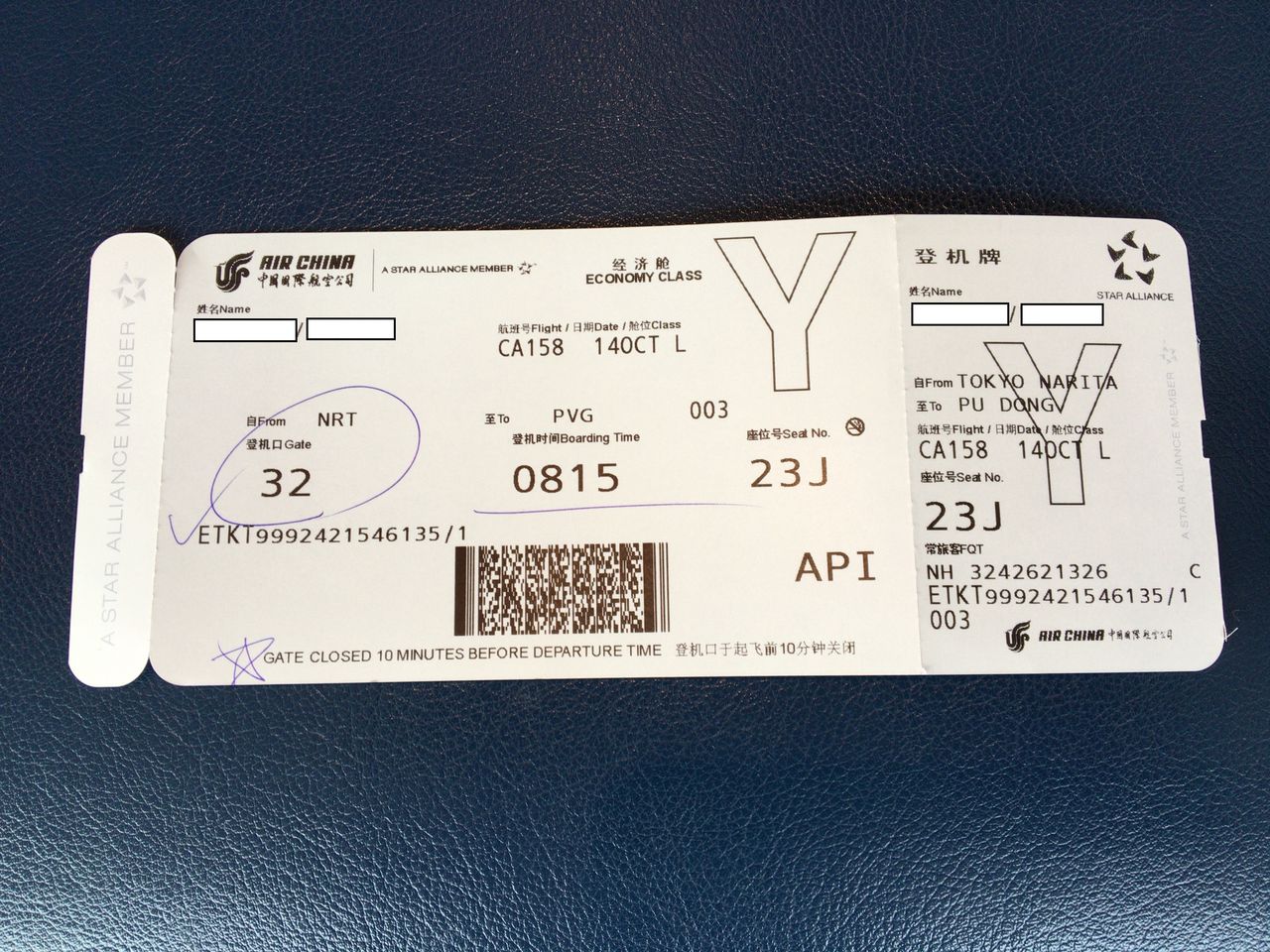中国国際航空 CA158便 成田-上海