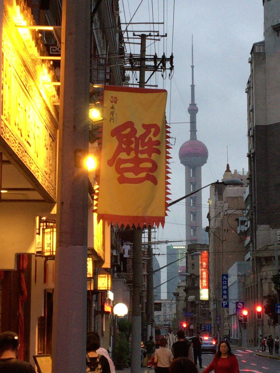 駅からは近いが大通りを一本入った所にあった。どでかい「蟹」の文字は日本語と同じなので遠くからでもわかった。奥に見えているのは上海のシンボル「東方明珠塔」である。
