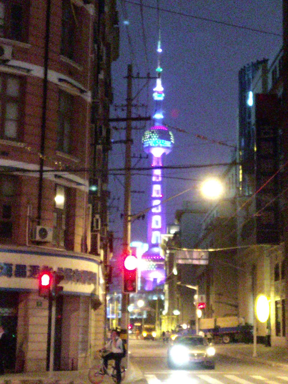 「東方明珠塔」がライトアップしていた。コースはすべて少量だったため、そこまで満腹にならず程よい感じにお腹一杯だった。 そして雑技が始まる時間は余裕のつもりが、意外にそうでもないことに気づきあわてて電車に乗った。