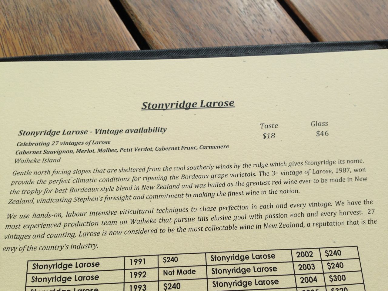 Tasteとはこの大きさか。これで18ドル!香りは最高。かなり複雑で濃厚なものだったが、いかにせん評価するには量が少なすぎ。