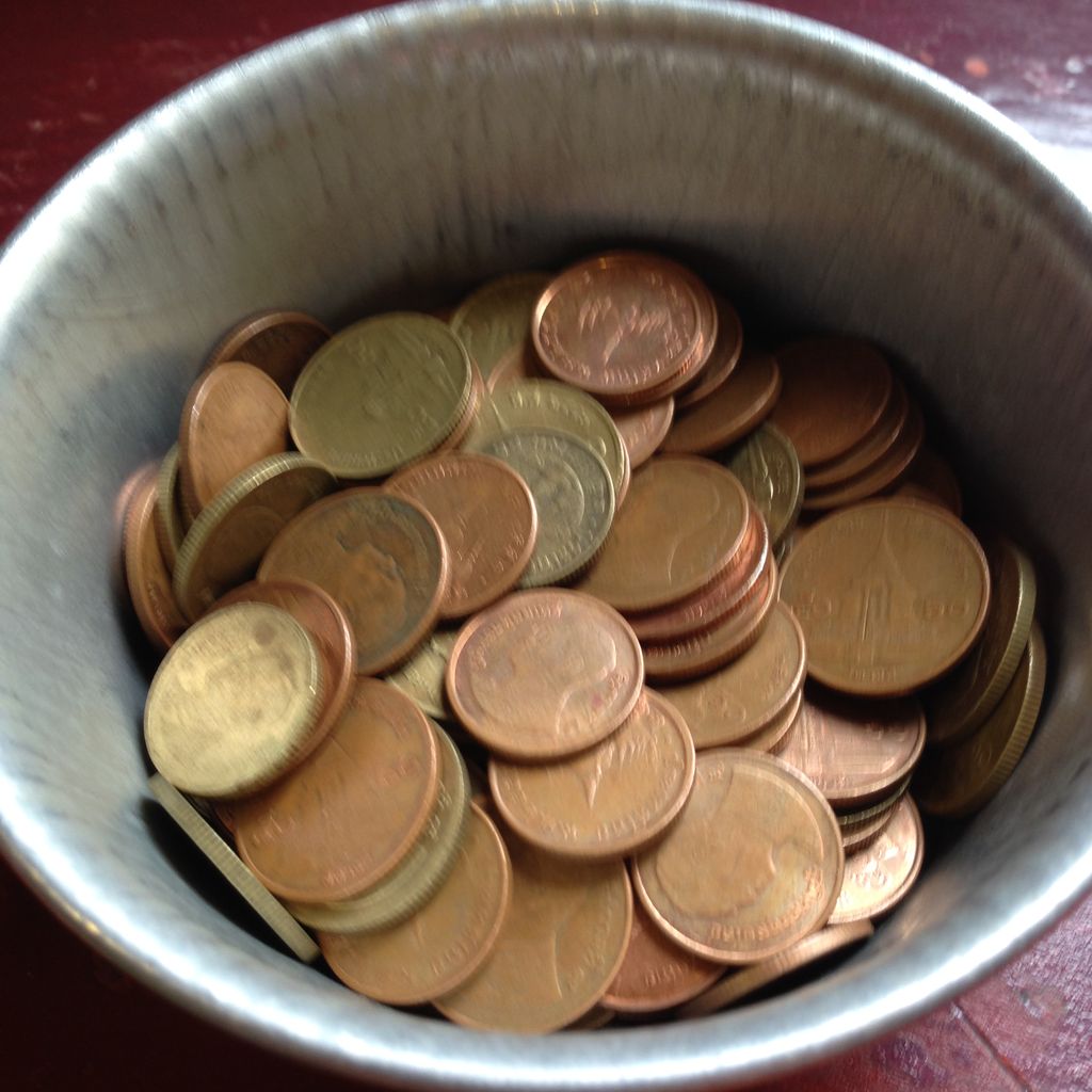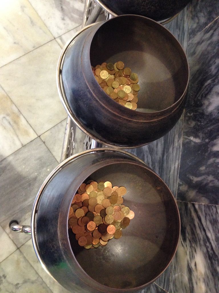 寝釈迦像の反対側にくると、うん?何だこの小銭の山は?